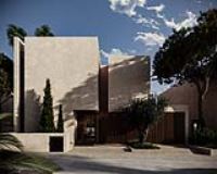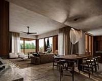 The architecture harmonizes natural materials—wood, stone, and travertine—with clean contemporary lines.